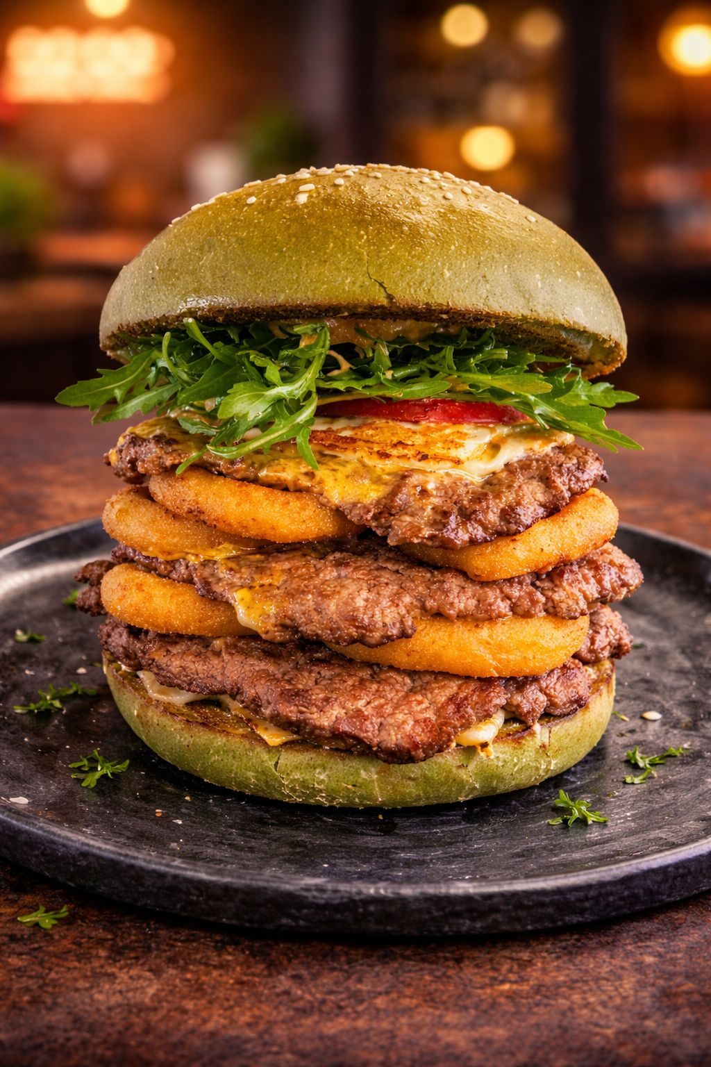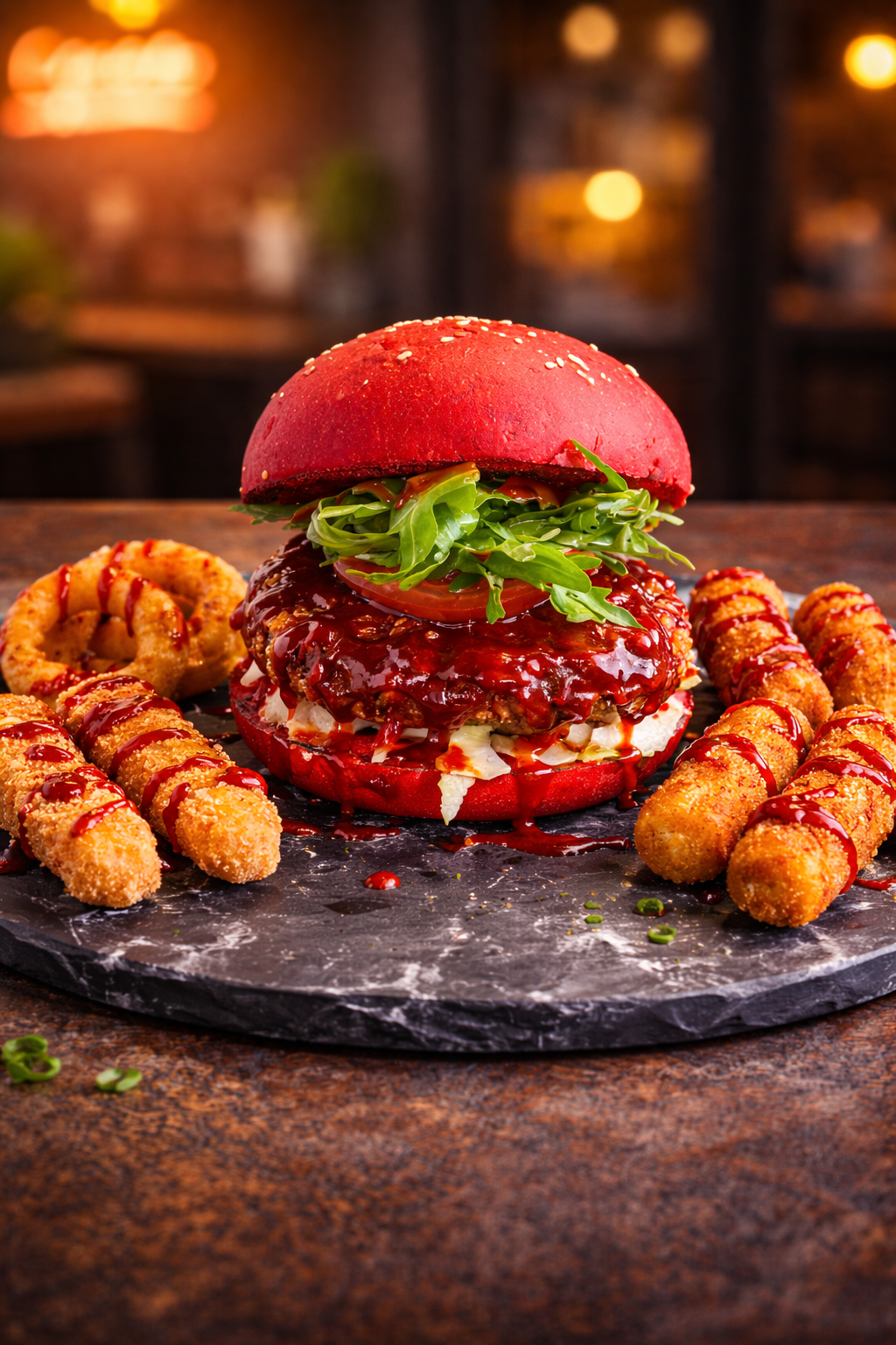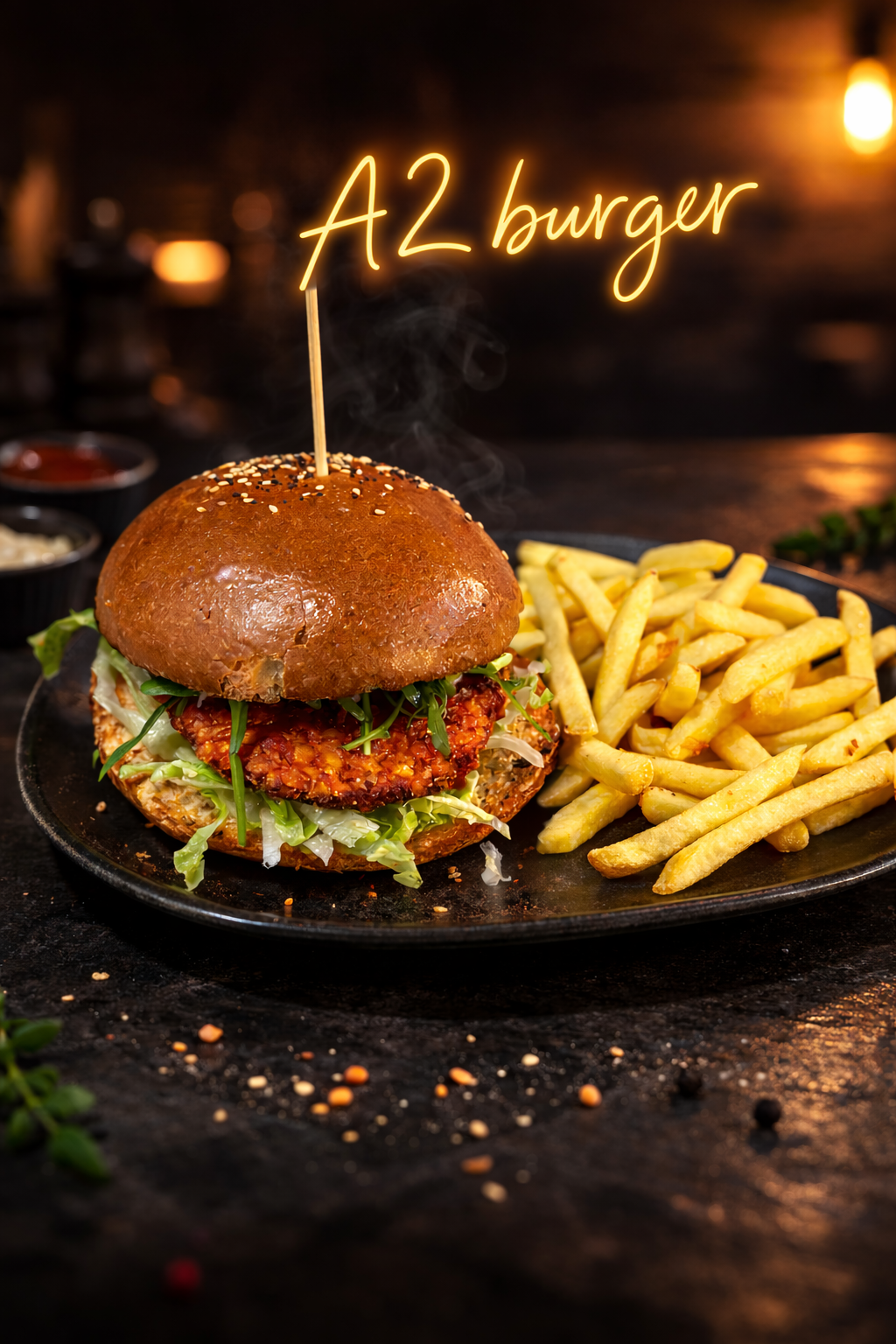 Vegetarischer Burger (2 stk. Gemüse-Patty) Vorgeformtes, tiefgekühltes Gemüse-Patty in Burgerform. ( Zutaten: Karotten, Zucchini, Erbsen, Mais, Kartoffel, usw.) Salat, Zwiebel,Rucolla,Tomatten,