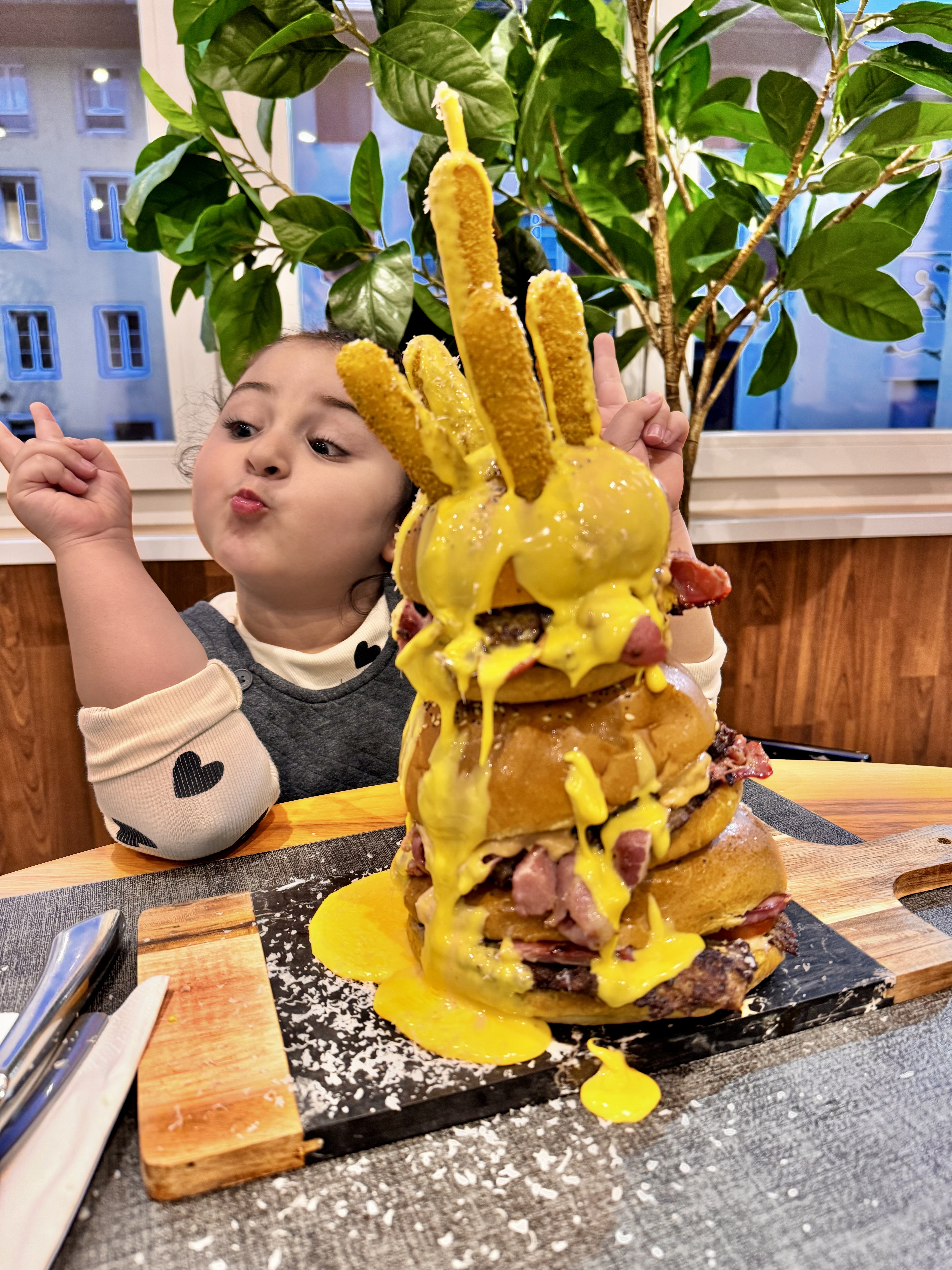 500 g Haus gemachte Burger Fleisch, Kalps Speck, Rösti Tasse Käse Sauce gefüttert, Ruccola, onion rings,Raclette Käse, Eier , Zwiebeln und mit Beilage Pommes